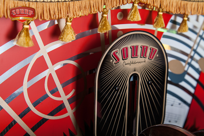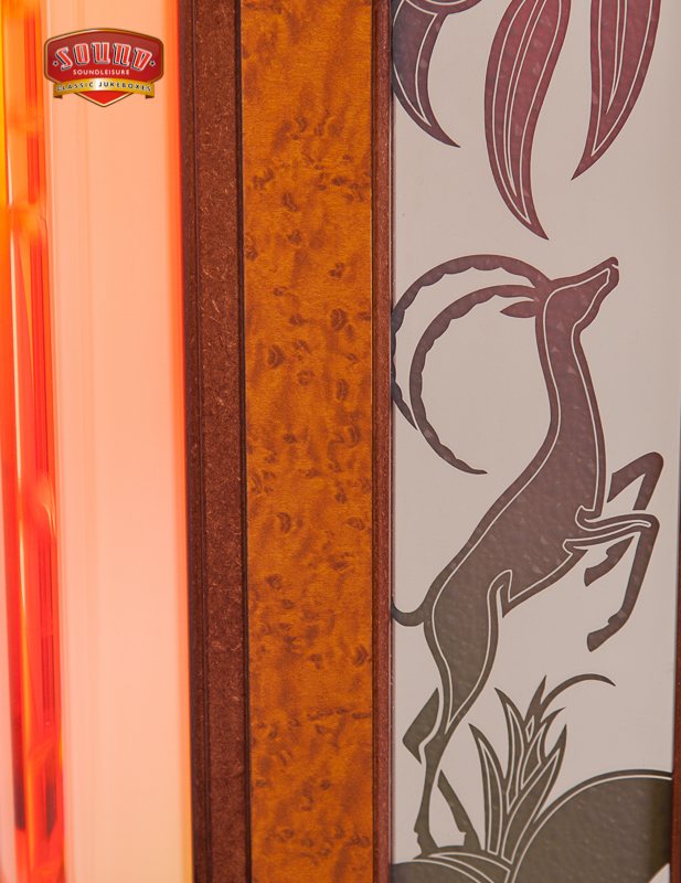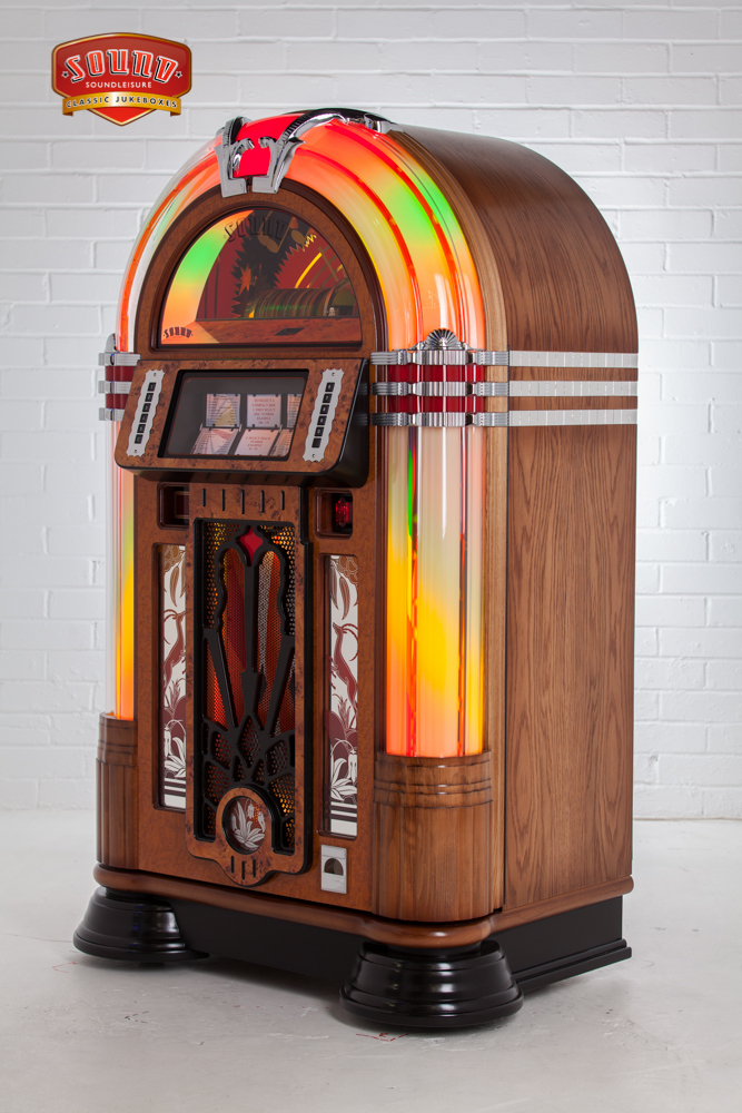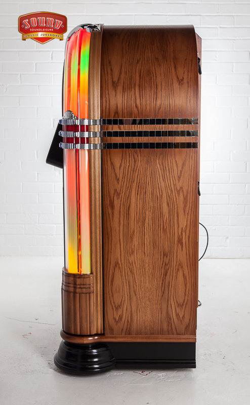 Newly manufactured jukebox, brand Sound Leisure, with aesthetic references to the old Wurlitzer models of the 1940s, but with a mechanism that can hold 80 CDs. Manufacture of the highest quality, materials and internal technology. The selection can be done either via a classic push-button panel or via a remote control. This model clearly recalls the Wurlitzer 950 from 1942.