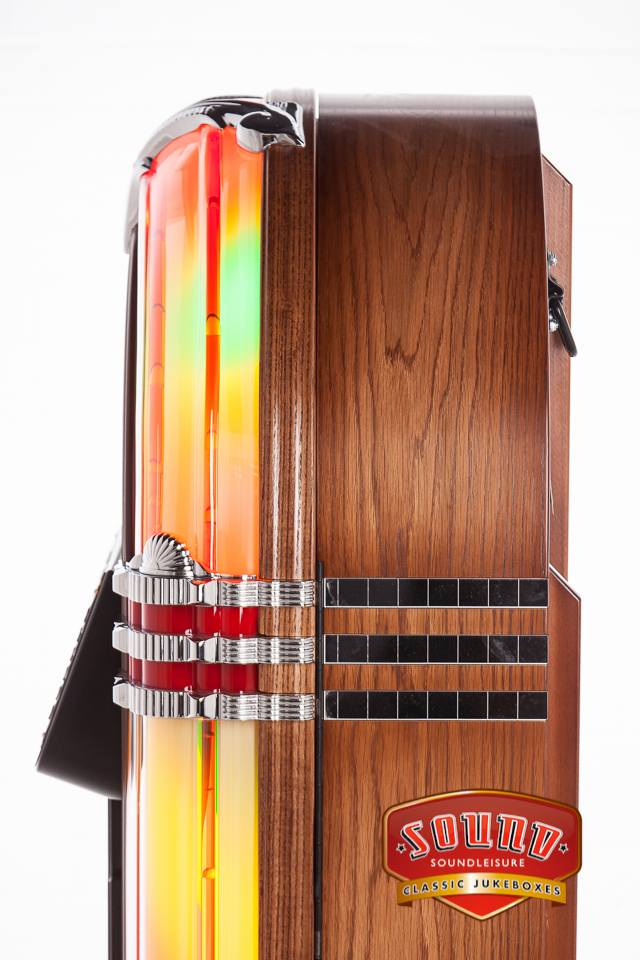 Newly manufactured jukebox, brand Sound Leisure, with aesthetic references to the old Wurlitzer models of the 1940s, but with a mechanism that can hold 80 CDs. Manufacture of the highest quality, materials and internal technology. The selection can be done either via a classic push-button panel or via a remote control. The difference between this model and the Manhattan model lies in the very little depth, which allows the Jukebox to be placed easily without being too bulky. This model clearly recalls the Wurlitzer 950 from 1942.